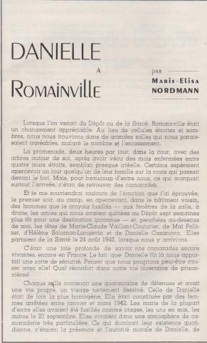 "A la Santé , elle a fait 8 jours de cachot sans nourriture. En sortant elle était méconnaissable tellement elle avait maigri et jauni. La raison de cette punition est aussi un trait de son caractère ; Danielle avait fait un poème à la mémoire de nos camarades qui venaient d'être fusillés. Le SS de garde est entré dans sa cellule pendant qu'elle le lisait à la fenêtre et a voulu lui arracher ce bout de papier, alors elle l'a avalé. Le lui laisser prendre aurait été une atteinte à sa dignité, une violation de ses sentiments."