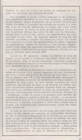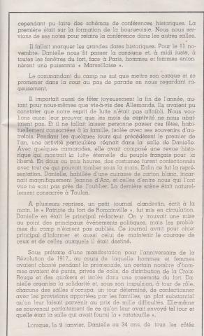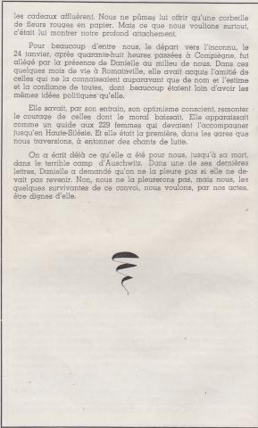 "Lorsqu'elle sortit de là, ses amies qui la regardaient passer ne la reconnurent pas. Leur Danielle si saine, si forte, avait maigri d'une façon effrayante, son visage coloré était devenu d'un jaune verdâtre. Mais elle souriait, comme toujours. Arrivée dans sa cellule, elle se remit à chanter et à faire son journal parlé comme si de rien n'était."